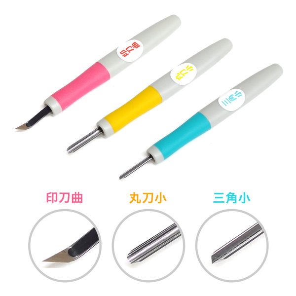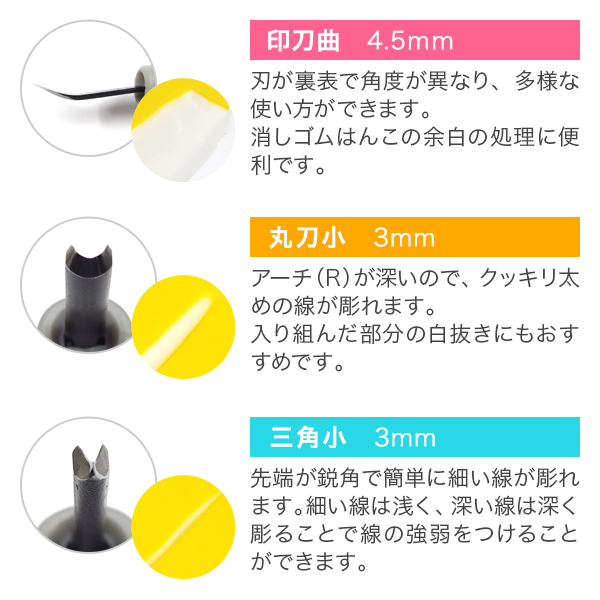 消しゴムはんこ専用オリジナル彫刻刀3本セット。コンパクトな刃先は、細部の彫刻や余白を綺麗に処理するのに便利です。